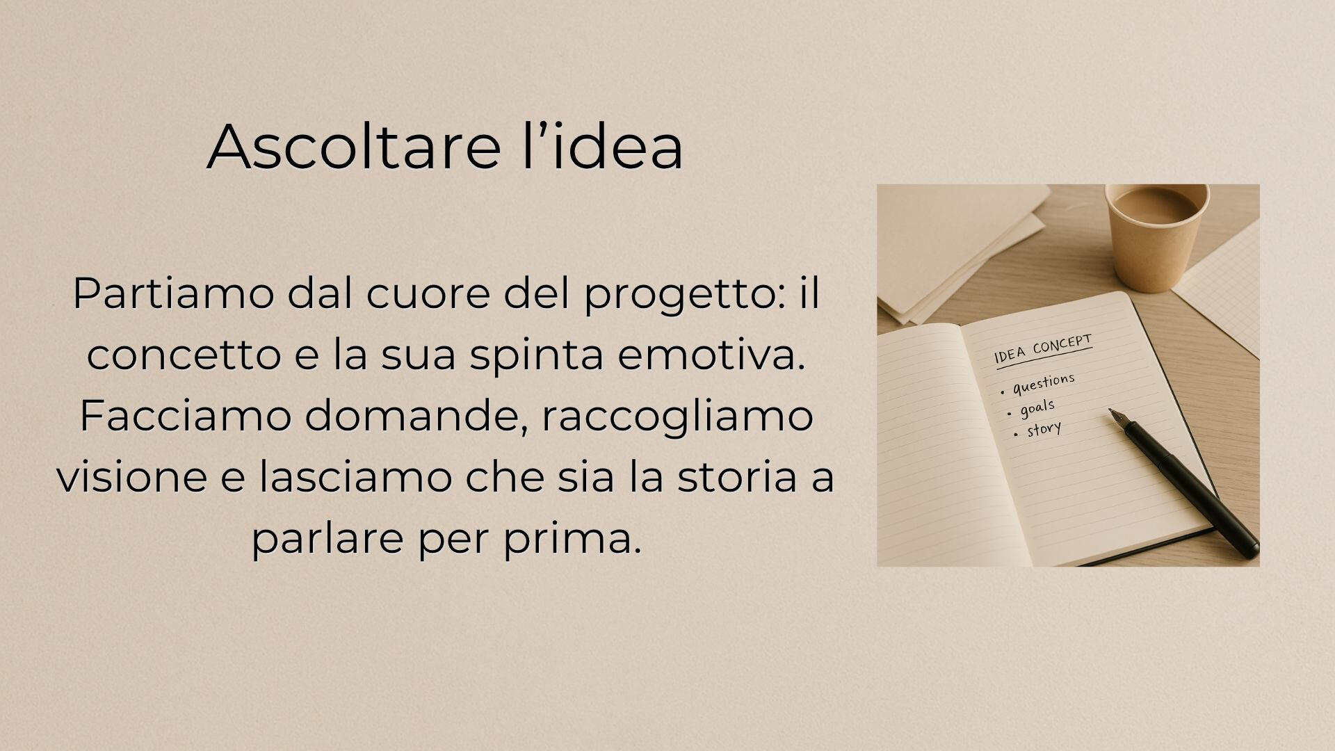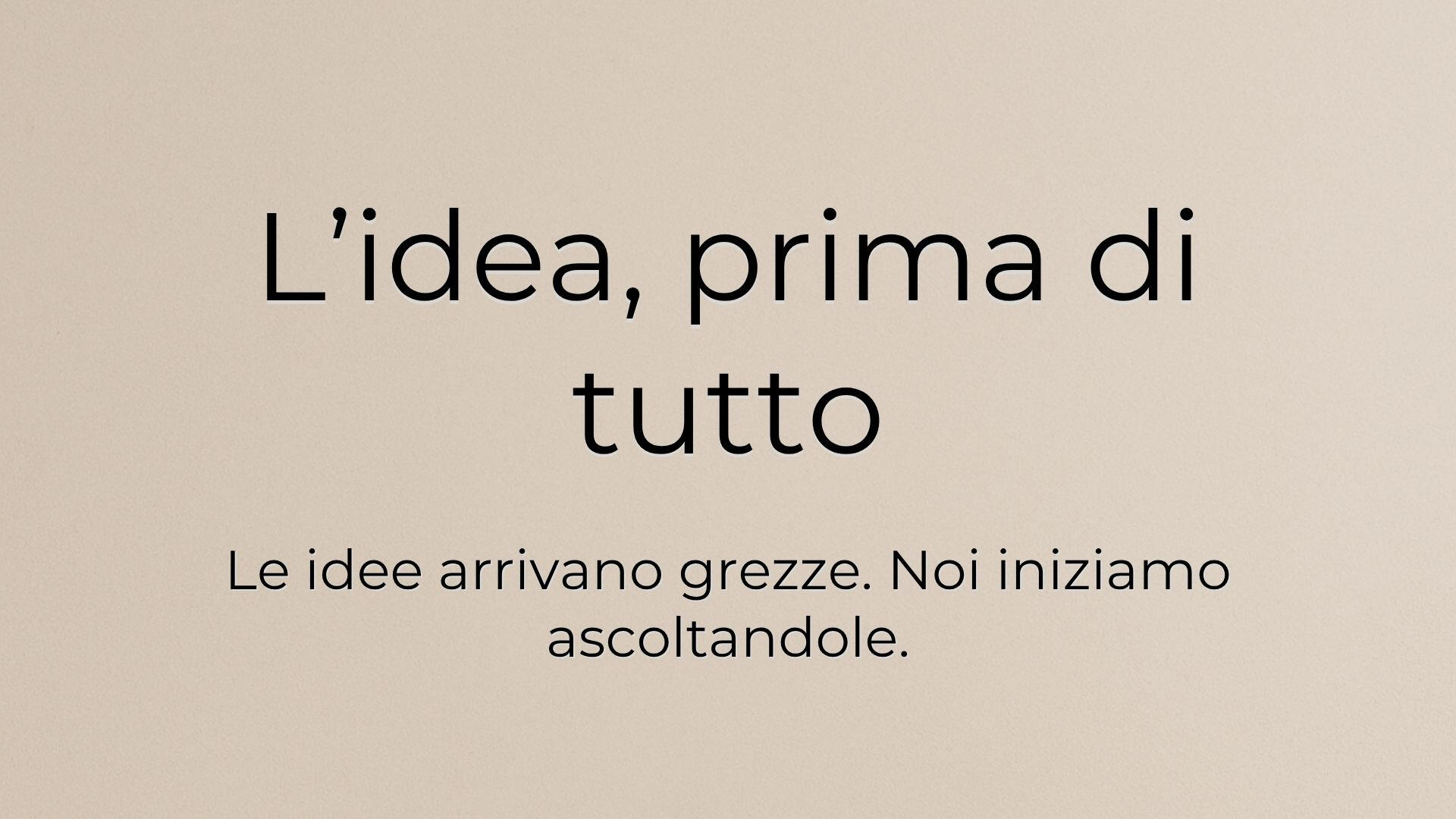 Lavoriamo su materiali che non solo mostrano un’idea, ma la posizionano.Siamo selettivi, ma se c’è sintonia, costruiamo con determinazione.Una buona idea può bastare.